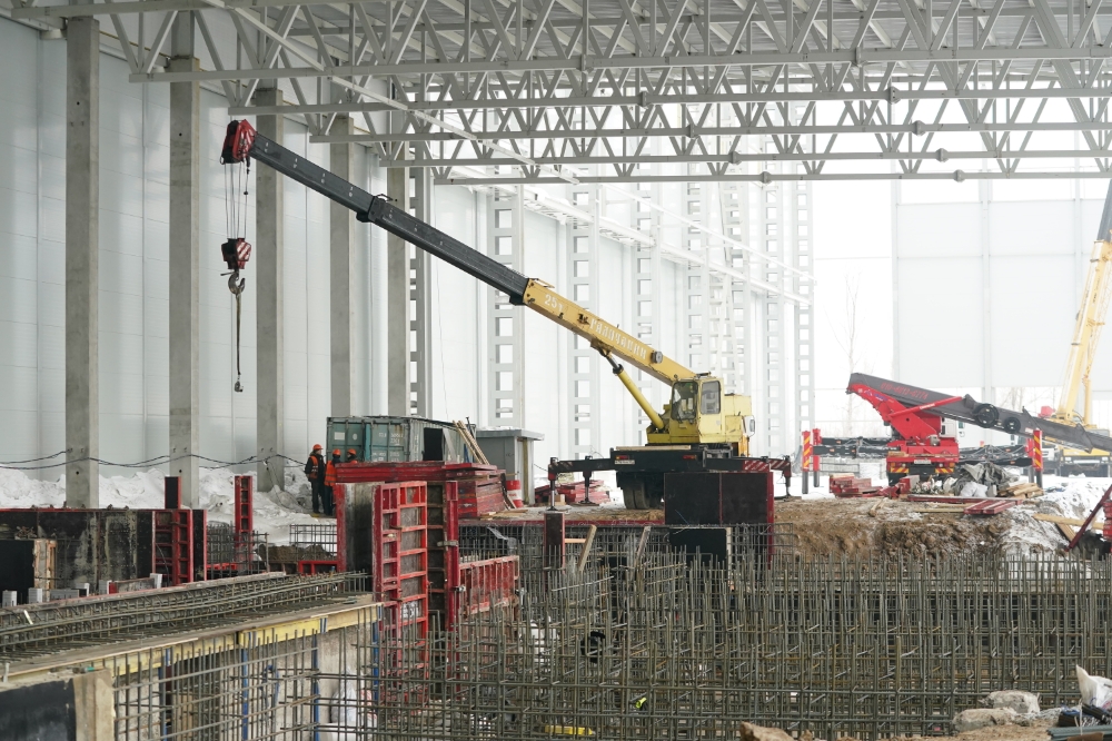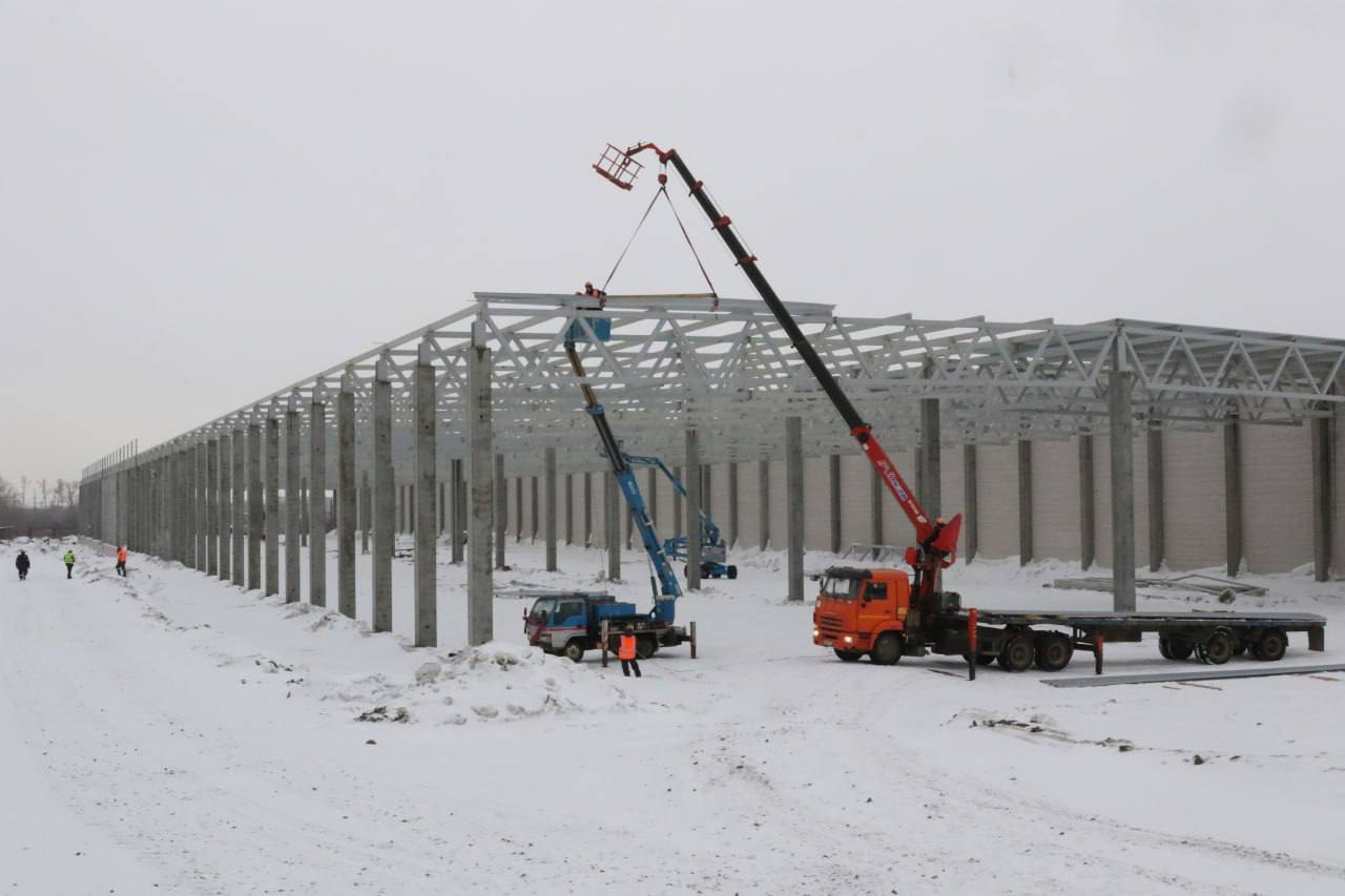 В настоящее время идет монтаж стенового и кровельного ограждения комбината, начат монтаж фундаментов под энергетическое и технологическое оборудование, продолжается возведение второго корпуса.
