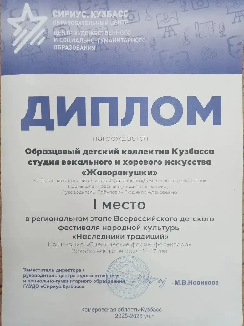 Промышленновский округ в номинации «Сценические формы фольклора» в возрастной категории 14-17 лет представил Образцовый детский коллектив Кузбасса, студия вокального и хорового искусства «Жаворонушки» Дома детского творчества, художественный руководитель Людмила Алексеевна Табулович.