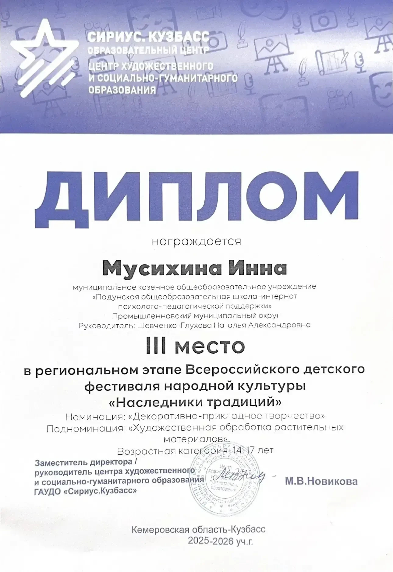 В номинации «Декоративно-прикладное творчество», подноминация «Художественная обработка растительных материалов», Инна Мусихина, учащаяся Падунской школы-интерната, руководитель Наталья Александровна Шевченко-Глухова, заняла 3 место.