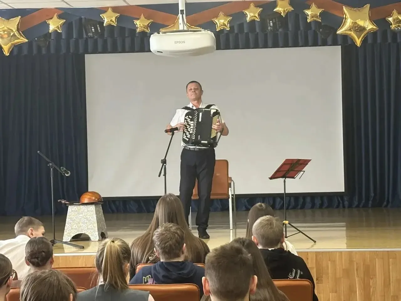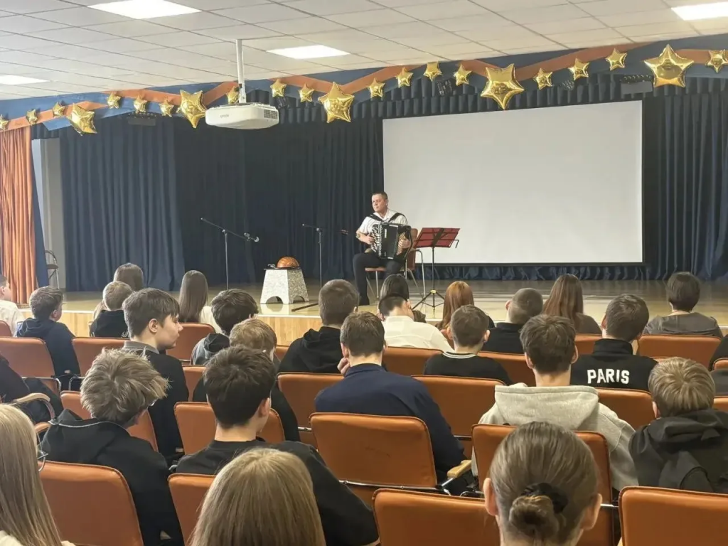 Для учащихся старших классов Промышленновской школы № 2 прошел концерт «Играй, мой баян». Преподаватель Детской школы искусств им. В.И. Косолапова Юрий Васильевич Серов исполнил для слушателей интересную программу: от заводных танцевальных ритмов до лирических мелодий.